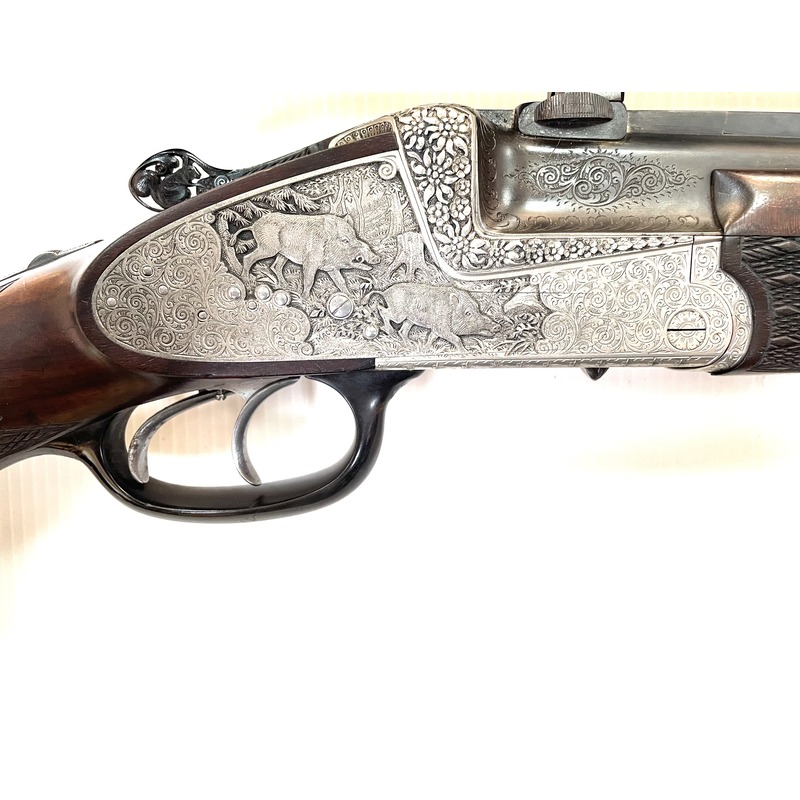 Werkelijk schitterend gegraveerde Winkler Ferlach voorzien van Zeiss kijker met variabele vergroting 1.5 – 6 keer. Gravures met roodwild, zwartwild, eland en verder diverse arabesken, edelweiss, let u ook op de details zoals het eekhoorntje in de sleutel.